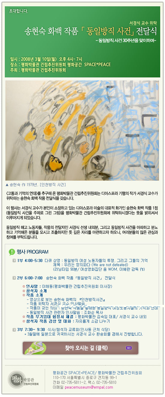 µ¿ÀϹæÁ÷ »ç°Ç 30ÁÖ³âÀ» ¸ÂÀÌÇÏ¿© ¼°æ½Ä ±³¼ö(ÀϺ» µµÄì°ÔÀÌÀÚÀÌ´ëÇб³)°¡ Æòȹڹ°°ü¿¡ À§Å¹ÇÏ´Â ¼ÛÇö¼÷ ȹé ÀÛǰ <µ¿ÀϹæÁ÷ »ç°Ç> Àü´Þ½Ä¿¡ ¿©·¯ºÐÀ» ÃÊ´ëÇÕ´Ï´Ù.
