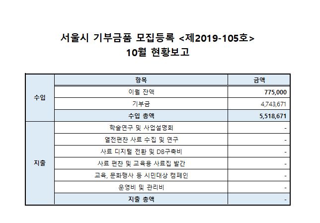 ***¼¿ï½Ã ±âºÎ±Ýǰ ¸ðÁýµî·Ï <Á¦2019-105È£> 10¿ù ÇöȲº¸°í